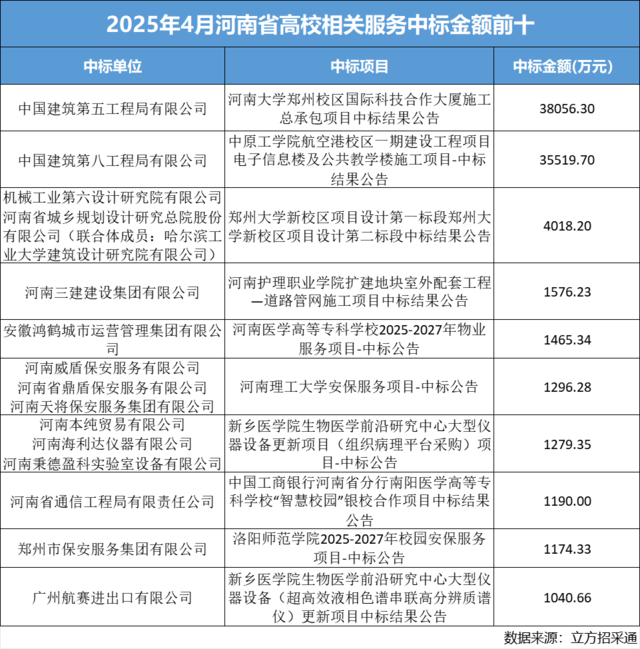 从中标环节来看,2025年4月,河南省高校相关服务中标项目317个,招标金额达千万元以上的项目11个。其中,中国建筑第五工程局有限公司3.81亿元中标河南大学郑州校区国际科技合作大厦施工总承包项目,位居中标金额首位。