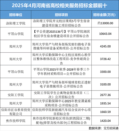 从招标环节来看,据立方招采通数据,2025年4月,河南省高校相关服务招标项目368个,招标金额达千万元以上的项目13个。洛阳理工学院开元校区璞苑5号学生宿舍建设项目施工项目预算金额1.3亿元,位居招标金额首位。